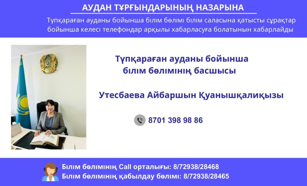 Түпқараған ауданы тұрғындарының назарына!Мамыр 21, 2025Мамыр 27, 2025 Білім саласына қатысты сұрақтар бойынша келесі телефондар арқылы хабарласуға болатынын хабарлайды.☎️Білім бөлімінің басшысы Утесбаева Айбаршын Куанышкалиевна870139898868/72938/28-4-65 Leave a Reply Cancel replyYour email address will not be published. Required fields are marked *Name * Email * Website Comment * Save my name, email, and website in this browser for the next time I comment.